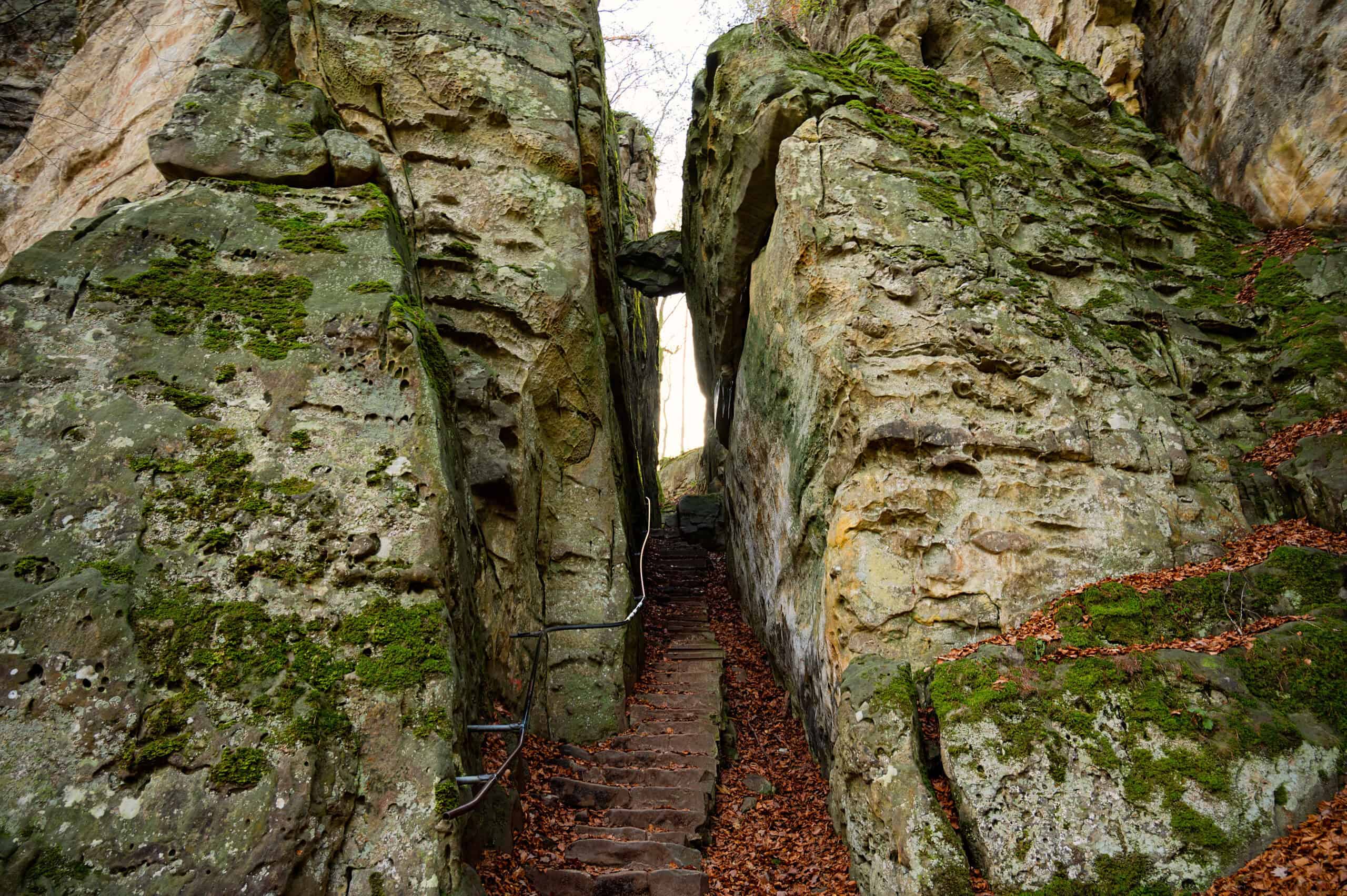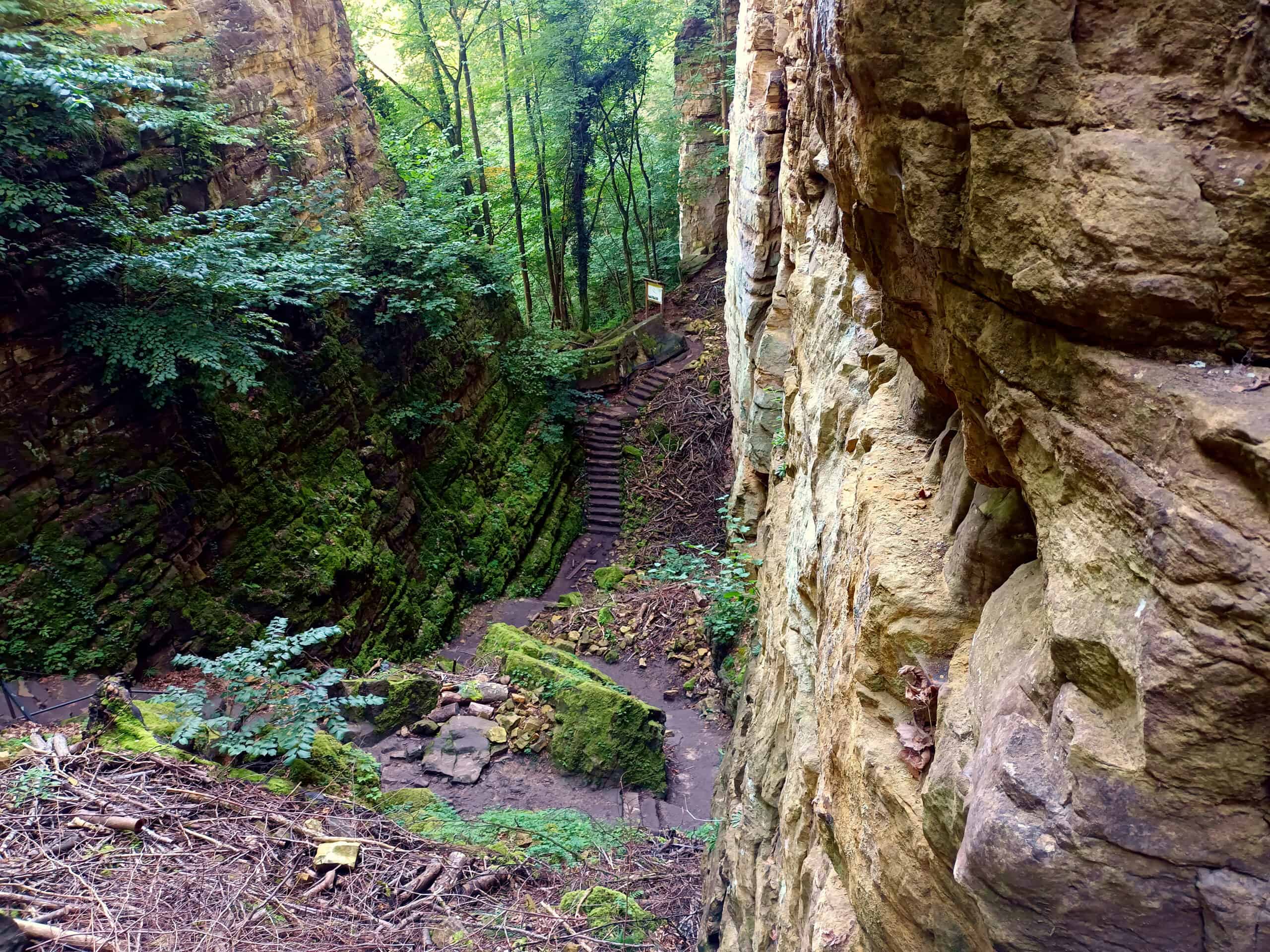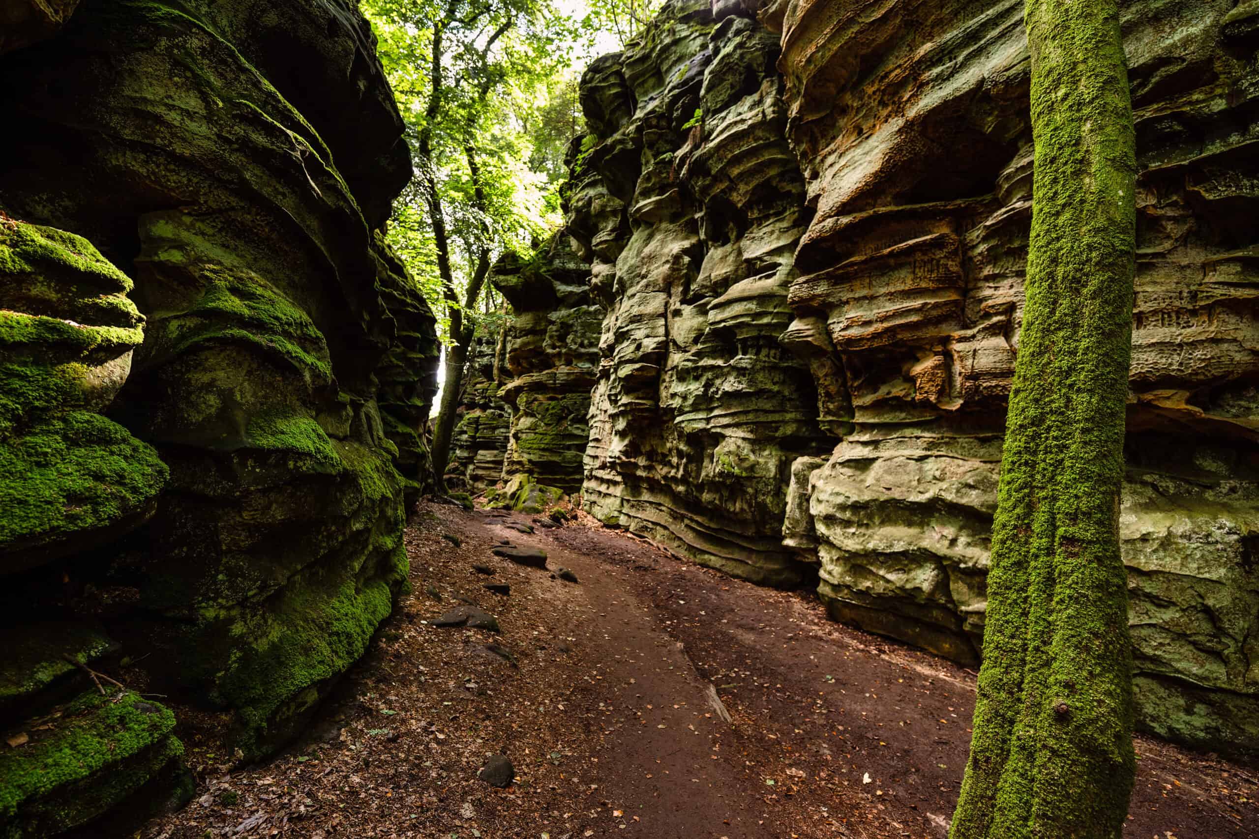 Ce territoire se distingue par ses impressionnants blocs et falaises de grès, sculptés au fil des millénaires par l’érosion. Parmi les sites les plus emblématiques figure la spectaculaire Teufelsschlucht (« gorge du Diable »), un défilé rocheux étroit où d’immenses parois semblent se refermer sur les visiteurs. Certaines formations adoptent des silhouettes étonnantes, à l’origine de nombreuses légendes et traditions locales.
